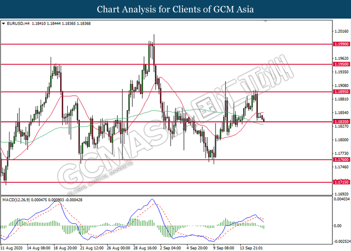 EURUSD, H4: EURUSD was traded lower while currently testing the support level. MACD which illustrate bearish signal suggests the pair to extend its losses after closing below 1.1835.