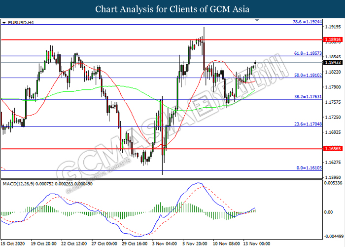 EURUSD, H4: EURUSD was traded higher following prior breakout above the previous resistance level at 1.1810. MACD which illustrated increasing bullish momentum suggest the pair to extend its gains toward resistance level at 1.1855.
