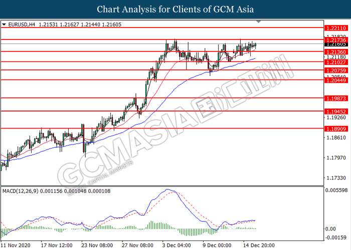 EURUSD, H4: EURUSD was traded higher following prior breakout above the previous resistance level at 1.2135. MACD which illustrated increasing bullish momentum suggest the pair to extend its gains toward the resistance level at 1.2175.