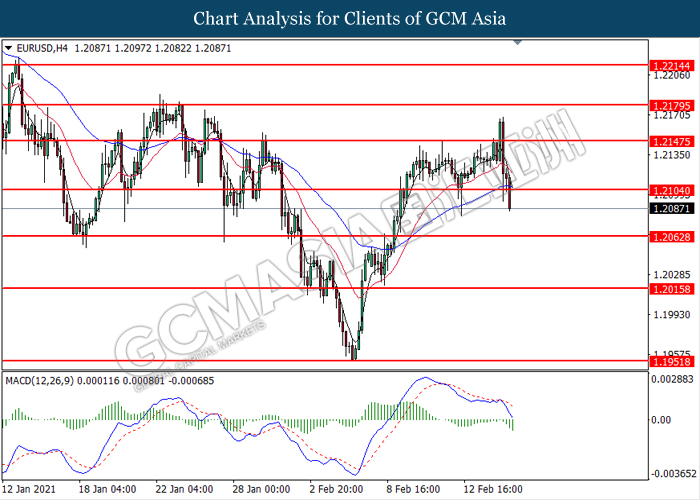 EURUSD, H4: EURUSD was traded lower following prior breakout below the previous support level at 1.2105. MACD which illustrated bearish bias momentum suggest the pair to extend its losses toward the support level at 1.2065.