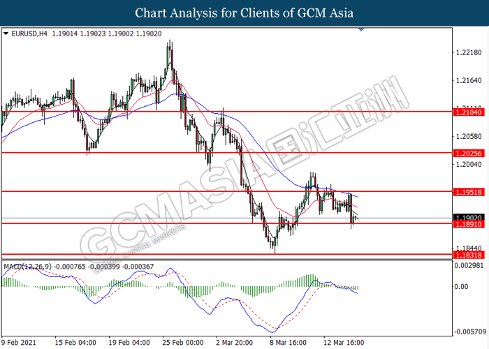 EURUSD, H4: EURUSD was traded lower while currently testing near the support level at 1.1890. MACD which illustrated bearish bias momentum suggest the pair to extend its losses after it successfully breakout below the support level.