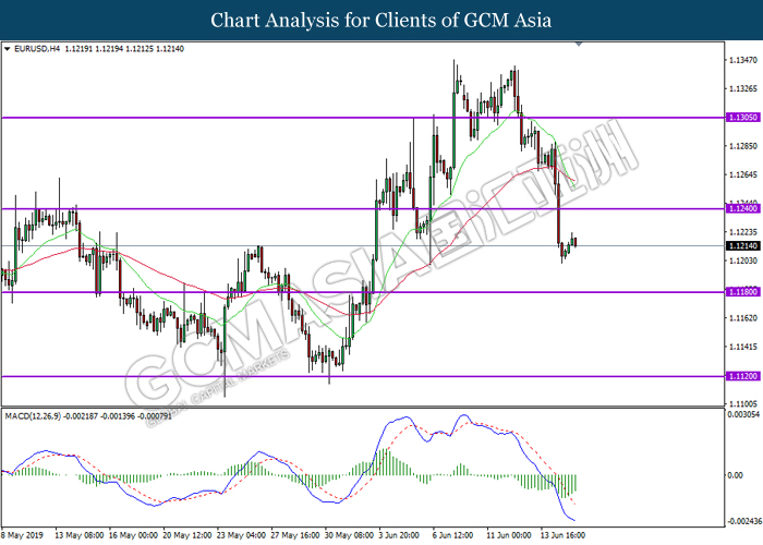 EURUSD, H4: EURUSD was traded higher following prior rebound from its lower level. MACD which illustrate diminished downward momentum suggests the pair to be traded higher in short-term as technical correction.