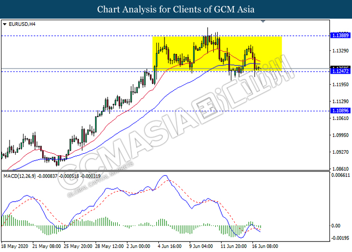 EURUSD, H4: EURUSD remain traded in a sideway channel while currently retest the support level 1.1245. However, MACD which illustrate bearish bias signal with the formation of death cross suggest the pair to be traded lower after it breaks below the support level.