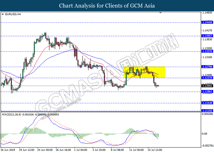 EURUSD, H4: EURUSD was traded lower following prior breakout below the previous support level 1.1235. However, MACD which starting to display bullish bias signal suggest the pair to undergo a technical correction in short term towards the resistance level 1.1235.