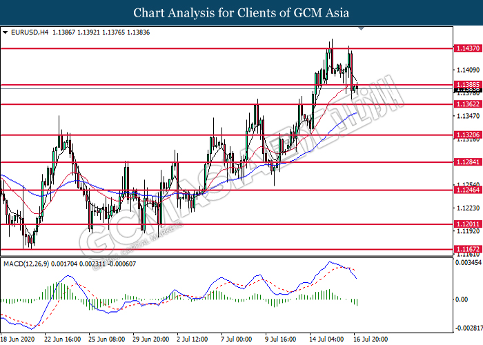 EURUSD, H4: EURUSD was traded lower following prior breakout below the previous support level at 1.1390. MACD which illustrate bearish bias momentum signal suggest the pair to extend its losses toward the support level at 1.1360.