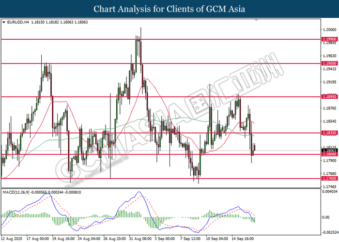 EURUSD, H4: EURUSD was traded lower while currently testing at 1.1800. MACD which illustrate bearish signal suggests the pair to extend its losses after closing below the support level.