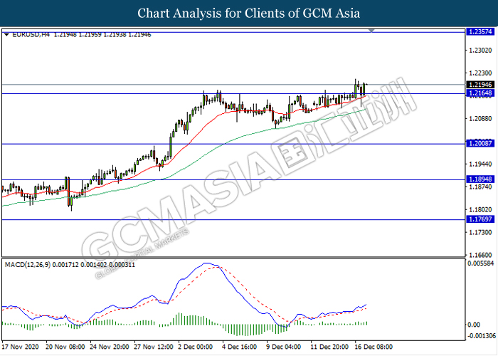 EURUSD, H4: EURUSD was traded higher following prior breakout above the previous resistance level 1.2165. MACD which illustrate bullish momentum signal suggest the pair to extend its gains towards the resistance level 1.2355.