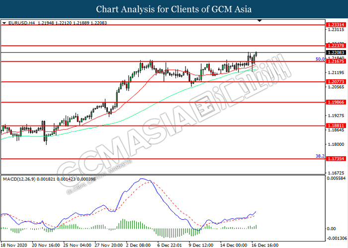 EURUSD, H4: EURUSD was traded higher following prior rebound from the support level at 1.2165. MACD which illustrated increasing bullish momentum suggest the pair to extend its gains toward resistance level at 1.2240.