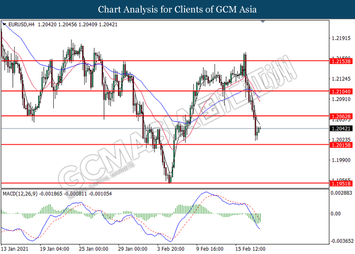 EURUSD, H4: EURUSD was traded higher following prior rebound from the lower level. MACD which illustrated diminishing bearish momentum suggest the pair to extend its gains toward the resistance level at 1.2065.