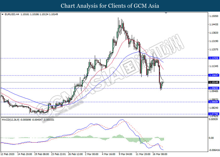 EURUSD, H4: EURUSD was traded higher following prior rebound from the support level 1.0970. MACD which illustrate diminishing bearish momentum suggests the pair to extend its rebound towards the resistance level 1.1065.