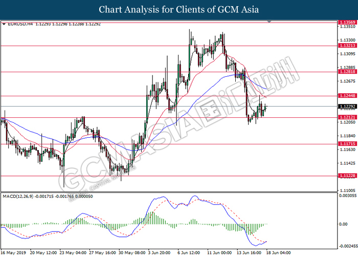 EURUSD, H4: EURUSD was traded higher following prior rebound from its lower level. MACD which illustrate diminishing bearish momentum and the formation of golden cross suggests the pair to extend its gains toward the resistance level at 1.1245.