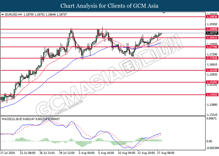 EURUSD, H4: EURUSD was traded higher following prior breakout above the previous resistance level at 1.1840. MACD which illustrate ongoing bullish momentum signal suggest the pair to extend its gains toward the resistance level at 1.1900.