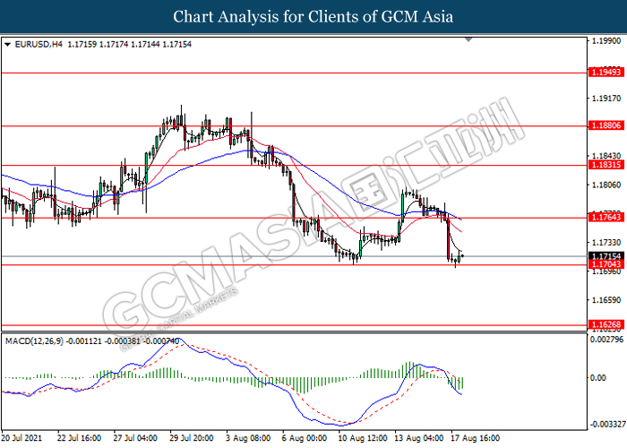 EURUSD, H4: EURUSD was traded lower while currently testing the support level 1.1705. MACD which illustrate bearish momentum signal suggest the pair to extend its losses after it breaks below the support level.