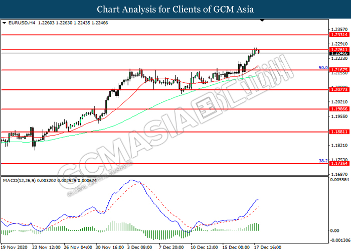 EURUSD, H4: EURUSD was traded higher while currently testing the resistance level at 1.2260. However, MACD which illustrated diminishing bullish momentum suggest the pair to be traded lower in short-term as technical correction.