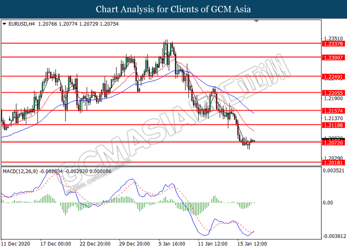 EURUSD, H4: EURUSD was traded higher following prior rebound from the support level at 1.2070. MACD which illustrated diminishing bearish momentum suggest the pair to extend its gains toward the resistance level at 1.2120.