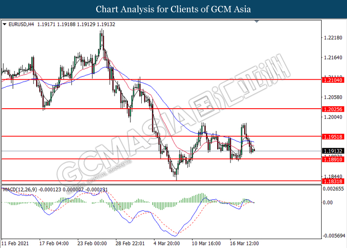 EURUSD, H4: EURUSD was traded lower following prior breakout below the previous support level at 1.1950. MACD which illustrated bearish momentum signal suggest the pair to extend its losses toward the support level at 1.1890.