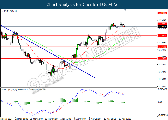 EURUSD, H4: EURUSD was traded higher while currently testing the resistance level at 1.1985. However, MACD which illustrated increasing bearish momentum suggest the pair to be traded lower in short-term as technical correction.