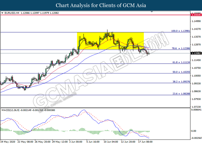 EURUSD, H4: EURUSD was traded lower following prior breakout below the previous support level at 1.1240. However, MACD which illustrate diminishing bearish momentum signal suggest the pair to undergo technical correction toward the resistance level at 1.1240.