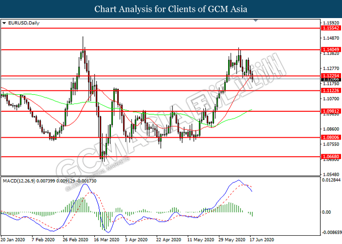 EURUSD, Daily: EURUSD was traded lower following prior breakout below the previous support level at 1.1225. MACD which illustrated increasing bearish momentum suggest the pair to extend its losses toward support level at 1.1125.