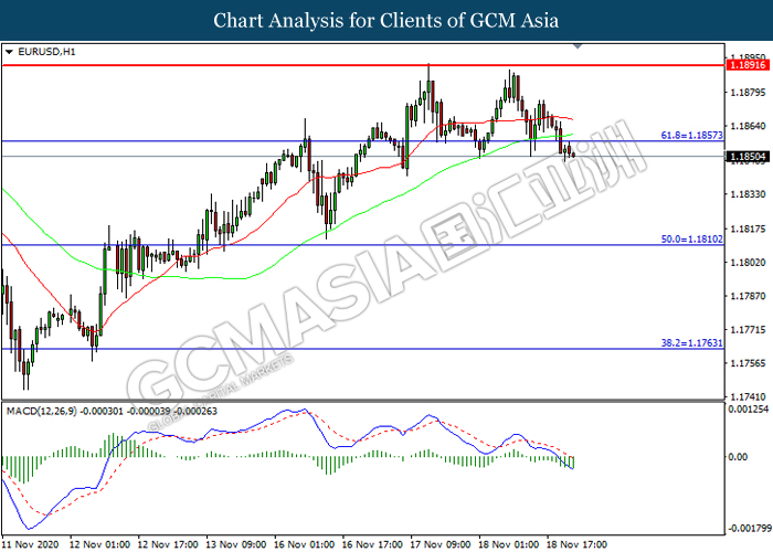 EURUSD, H1: EURUSD was traded lower following prior breakout below the previous support level at 1.1855. MACD which illustrated increasing bearish momentum suggest the pair to extend its losses toward support level at 1.1810.