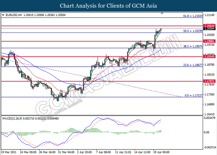 EURUSD, H4: EURUSD was traded higher following prior breakout above the previous resistance level at 1.2030. MACD which illustrated bullish bias momentum signal suggest the pair to extend its gains toward the resistance level at 1.2060.