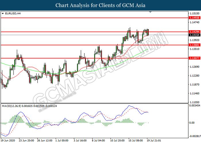 EURUSD, H4: EURUSD traded lower following prior retracement from the resistance level at 1.1430. MACD which illustrated increasing bearish momentum suggest the pair to extend its losses toward support level at 1.1370.