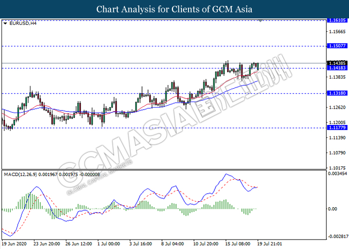 EURUSD, H4: EURUSD traded higher following prior rebound from the support level 1.1420. MACD which illustrate diminishing bearish momentum suggest the pair to extend its rebound towards the resistance level 1.1505.
