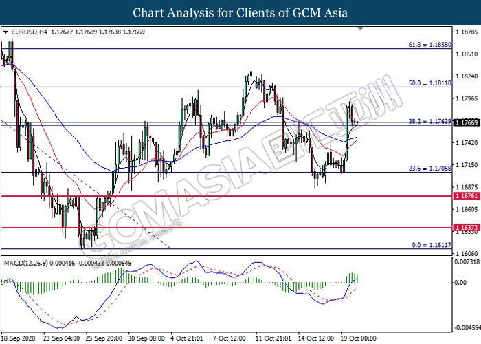 EURUSD, H4: EURUSD was traded lower while currently testing the support level at 1.1765. MACD which illustrate diminishing bullish momentum signal suggest the pair to extend its losses after it successfully breakout below the support level at 1.1765.