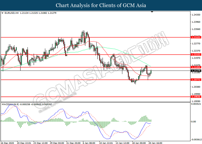 EURUSD, H4: EURUSD was traded higher following prior rebound from the support level at 1.2075. However, MACD which illustrated diminishing bullish momentum suggest the pair to be traded lower in short-term as technical correction.