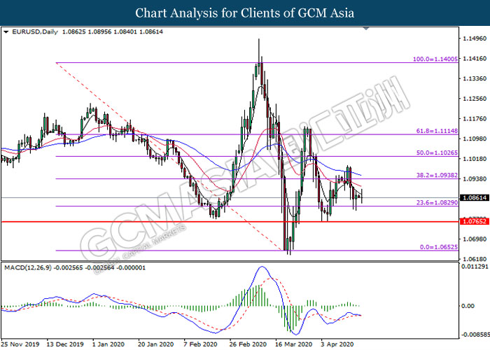 EURUSD, Daily: EURUSD was traded lower following prior breakout below the previous support level at 1.0940. MACD which illustrate diminishing bullish momentum suggest the pair to extend its losses toward the support level at 1.0830.