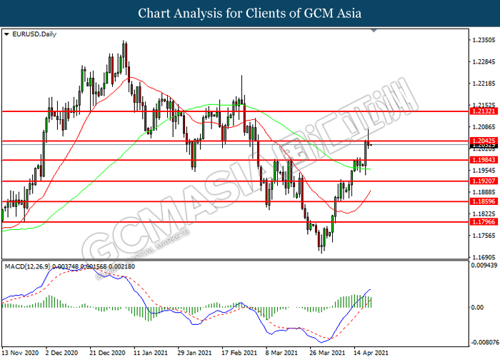 EURUSD, Daily: EURUSD was traded higher while currently testing the resistance level at 1.2045. However, MACD which illustrated diminishing bullish momentum suggest the pair to be traded lower in short-term as technical correction.