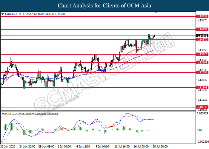 EURUSD, H4: EURUSD was traded higher following prior rebound from the support level at 1.1435. MACD which illustrate diminishing bearish momentum signal suggest the pair to extend its gains toward the resistance level at 1.1490.
