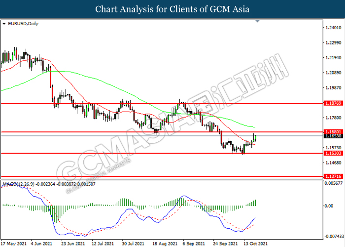 EURUSD, Daily: EURUSD was traded higher while currently testing the resistance level at 1.1680. MACD which illustrated increasing bullish momentum suggest the pair to extend its gains after it successfully breakout above the resistance level.
