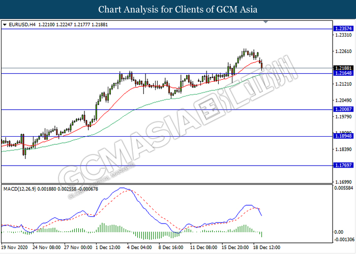 EURUSD, H4: EURUSD was traded lower while currently testing the support level 1.2165. MACD which illustrate bearish bias signal with the formation of death cross suggest the pair to extend its losses after it breaks below the support level.