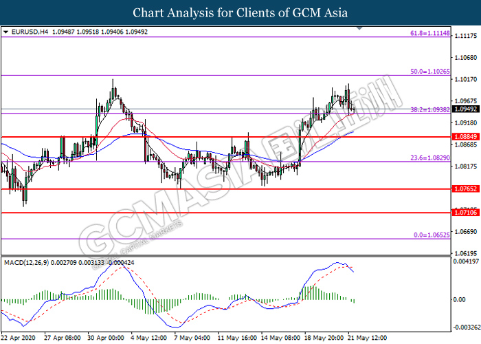 EURUSD, H4: EURUSD was traded lower following prior retracement from the higher level. MACD which illustrate bearish momentum with the formation of death cross suggest the pair to extend its losses toward the support level at 1.0940.
