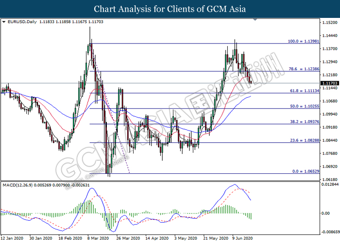 EURUSD, Daily: EURUSD was traded lower following prior breakout below the previous support level at 1.1240. MACD which illustrate bearish bias momentum signal suggest the pair to extend its losses toward the support level at 1.1115.