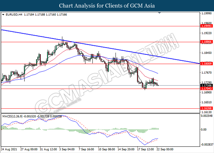 EURUSD, H4: EURUSD was traded lower while currently testing near the support level 1.1705. However, MACD which illustrate bullish momentum signal suggest the pair to be traded higher towards the resistance level 1.1800.