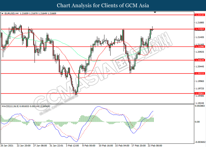 EURUSD, H4: EURUSD was traded higher while currently testing the resistance level at 1.2165. However, MACD which illustrated diminishing bullish momentum suggest the pair to be traded lower in short-term as technical correction.