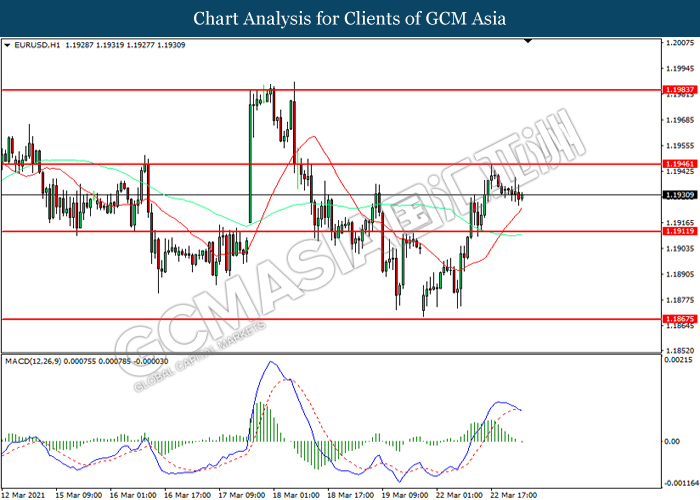 EURUSD, H1: EURUSD was traded lower following prior retracement from the resistance level at 1.1945. MACD which illustrated increasing bearish momentum suggest the pair to extend its losses toward support level at 1.1910.