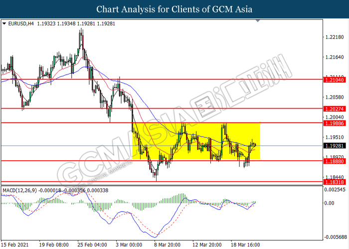 EURUSD, H4: EURUSD was traded lower following prior rebound from the support level at 1.1890. MACD which illustrated bullish bias momentum signal suggest the pair to extend its gains toward the resistance level at 1.1990.