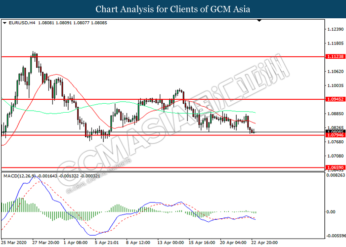 EURUSD, H4: EURUSD was traded lower while currently testing the support level at 1.0795. MACD which illustrated increasing bearish momentum suggest the pair to extend its losses after it successfully breakout below the support level.