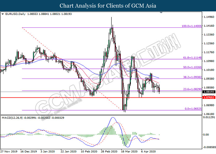 EURUSD, Daily: EURUSD was traded lower while currently testing the support level at 1.0830. MACD which illustrate bearish signal with the formation of death cross suggest the pair to extend its losses after its candle successfully closed below the support level.
