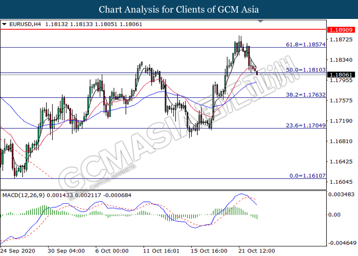 EURUSD, H4: EURUSD was traded lower while currently testing the support level at 1.1810. MACD which illustrate bearish bias momentum signal suggest the pair to extend its losses after it successfully breakout below the support level at 1.1810.