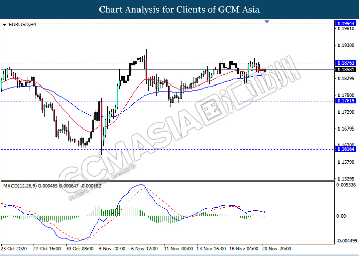 EURUSD, H4: EURUSD was traded flat near the resistance level 1.1875. However, MACD which illustrate bearish bias signal suggest the pair to be traded lower in short term towards the support level 1.1760.