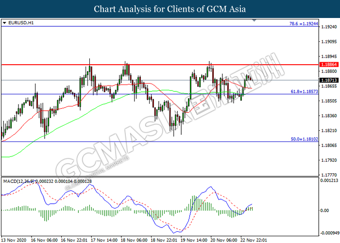 EURUSD, H1: EURUSD was traded higher following prior rebound from the support level at 1.1855. MACD which illustrated increasing bullish momentum suggest the pair to extend its gains toward resistance level at 1.1885.