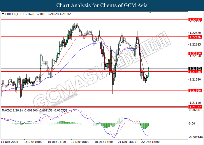 EURUSD, H1: EURUSD was traded higher while currently testing the resistance level at 1.2175. MACD which illustrated diminishing bearish momentum suggest the pair to extend its gains after it successfully breakout above the resistance level at 1.2175.