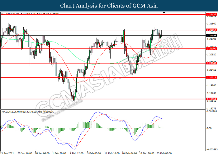 EURUSD, H4: EURUSD was traded lower following prior retracement from the resistance level at 1.2165. MACD which illustrated diminishing bullish momentum suggest the pair to extend its losses toward support level at 1.2110.
