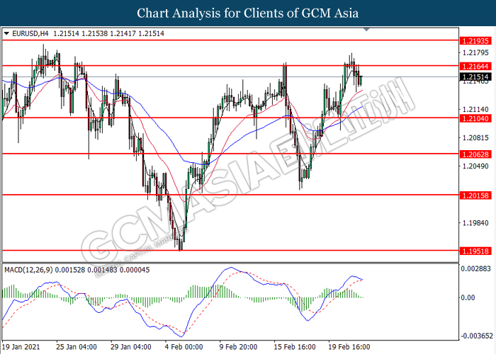 EURUSD, H4: EURUSD was traded lower following prior retracement from the resistance level at 1.2165. MACD which illustrated diminishing bullish momentum suggest the pair to extend its losses toward the support level at 1.2105.