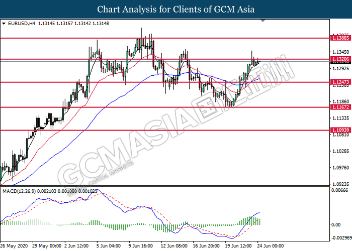 EURUSD, H4: EURUSD was traded higher while currently testing the resistance level at 1.1320. However, MACD which illustrate diminishing bullish momentum signal suggest the pair to undergo technical retracement toward the support level at 1.1245.