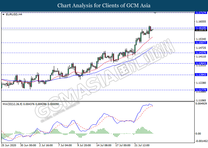 EURUSD, H4: EURUSD was traded higher while currently testing the resistance level 1.1610. However, MACD which display diminishing bullish momentum signal suggest the pair to experience a technical correction towards the support level 1.1505.